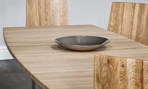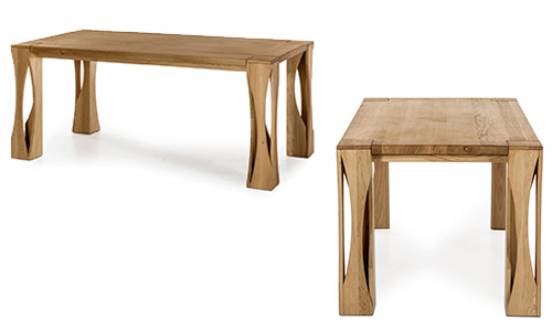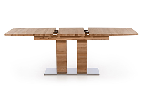Das ganz spezielle Design, der abgeschrägten Tischkante zu den Tischfüßen macht diesen Tisch, neben seiner leichtlaufenden ausziehbaren Tischplatte aus.